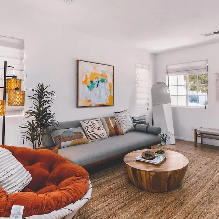 El diseño interior viene con un escritorio, así como televisión y TV de pantalla plana con canales vía satélite. Chic Mid-Century Boho Oasis - 15 Min To Old Town Villa ofrece un inodoro separado, bañera y una ducha, además de comodidades como una secadora y toallas de baño.